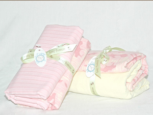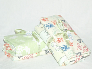 These receiving blankets are great! Larger than the blankets you get at department stores, they measure approx. 30"x40". Made from 100% cotton soft flannel and they come in a variety of hip and funky prints!