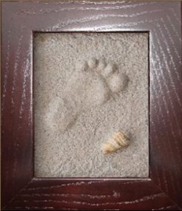 The finished product is a raised plaster cast of your child's hand or foot print or even your pet's paw print. It is displayed in a beautiful solid wood frame, available in black, honey, or mahogany.